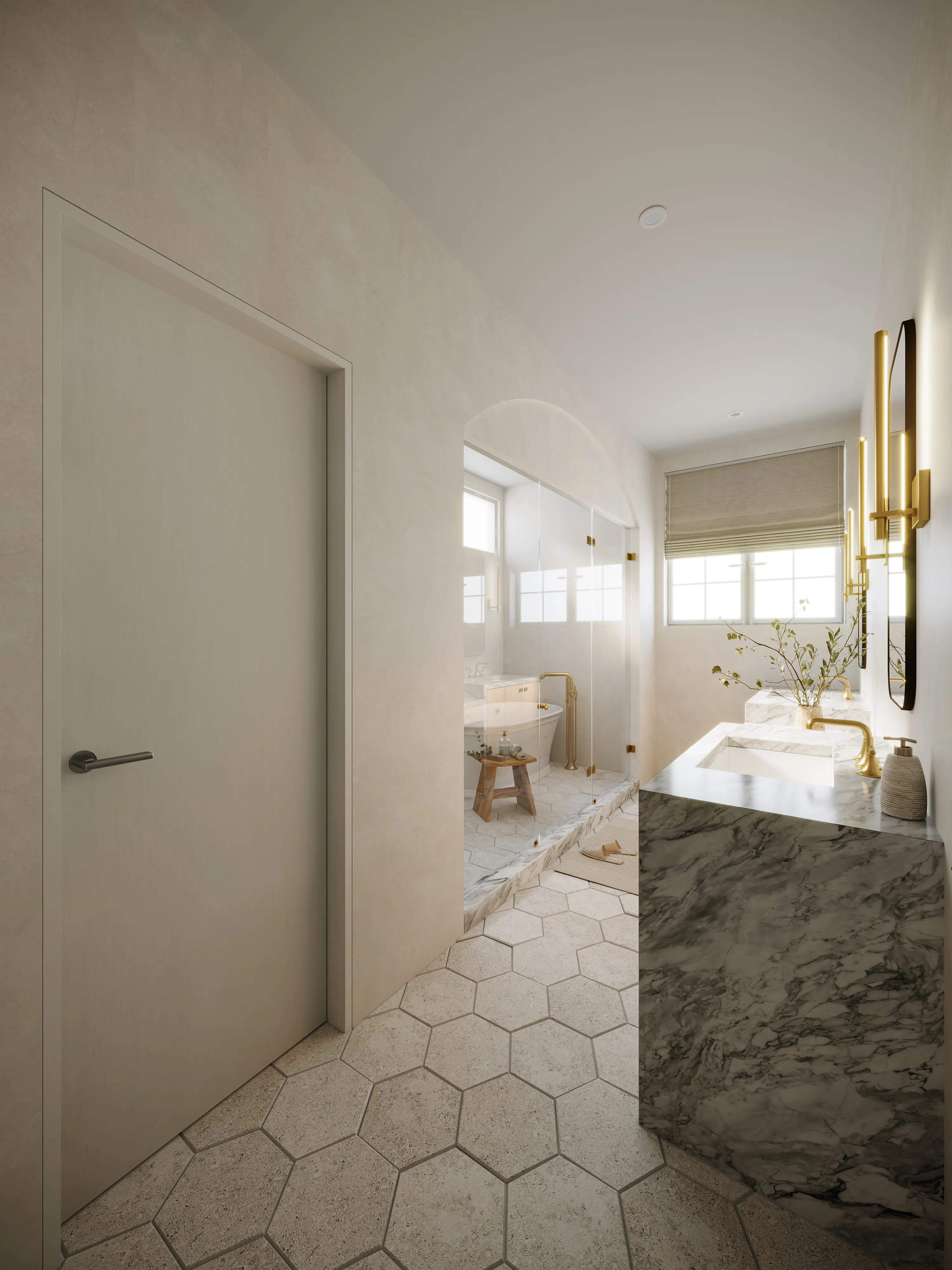 Multiple living spaces provide flexibility and comfort, including a formal living room with a plaster fireplace, a family room with a kitchenette for casual lounging, a functional laundry room, and a cozy upstairs reading nook. Luxury bathrooms throughout the home feature spa-inspired designs, with the primary bath boasting a freestanding tub, marble finishes, and dual vanities. Each bath showcases artisanal tilework, custom vanities, premium fixtures, and thoughtful lighting.